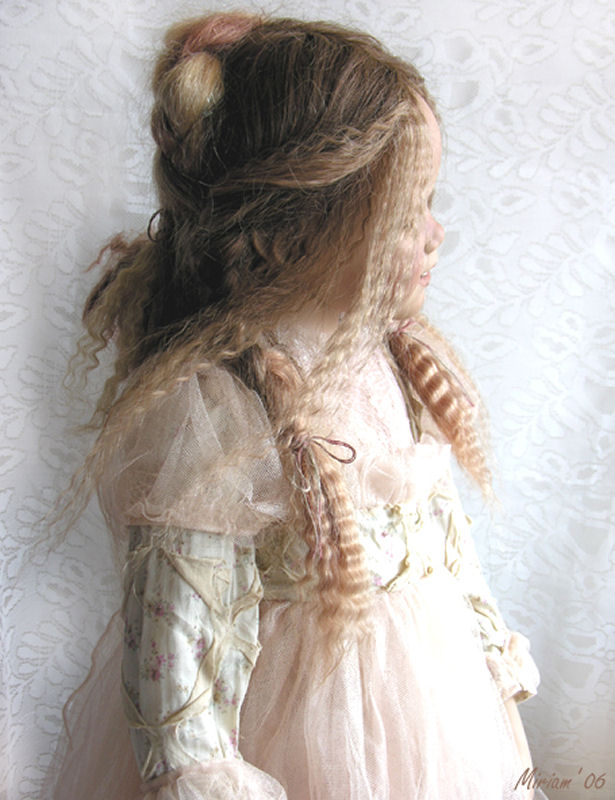 Hair: Brown human hair with blonde highlights in front and a loose braid on top of the head
